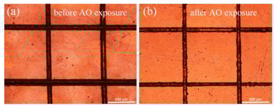 The adhesion strength of the as-prepared PHPS coating was determined by the cross-cut test according to the International Standard ISO 2409. Figure 4 shows the optical microscope photographs of the coated Kapton after the cross-cut test before and after AO exposure. The photographs show that the cut edges are neat and tidy, which display that the flaking of the PHPS coating before and after AO exposure did not occur. According to classification methods described in ISO 2409, this result demonstrates that the adhesion strength of the PHPS coating to the Kapton substrate is excellent.