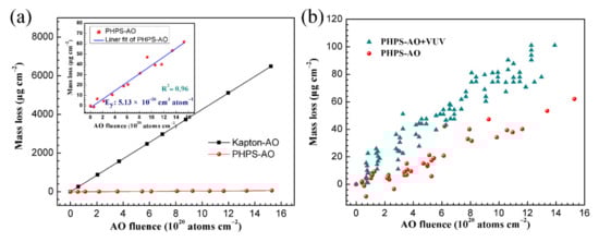 Dependence of the mass loss on the AO fluence for (a) prinstin and PHPS coated Kapton, that of the PHPS coated Kapton detailed in the inset figure and (b) PHPS coated Kapton after AO and AO + VUV exposure (Total fluence of AO exposure: 1.5 × 1021 atoms cm−2, VUV intensity: 9.56 μW cm−2).