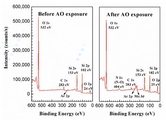 To reveal the AO resistance of the PHPS coating, the elemental composition and lateral and depth distribution of elements of the coating were investigated by XPS. Figure 6 shows the survey scan of the PHPS coating before and after AO exposure. To prevent the effect of the contamination layer on the sample, both samples were etched by Ar+ for 30 s before testing. The survey spectra reveal that the coating surface was simply and clearly composed of O, Si, C, and N elements. After AO exposure, the N 1s emerged as N-O. Peaks located at binding energies of 230 eV and 241 eV corresponded to Mo 3d5/2 and Ar 2p3/2, respectively. These were contaminations induced by the Mo plate (neutralizer in the AO erosion facility) and Ar-ion etching.
