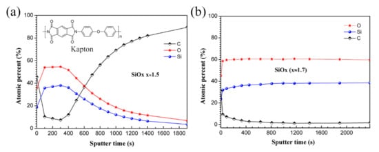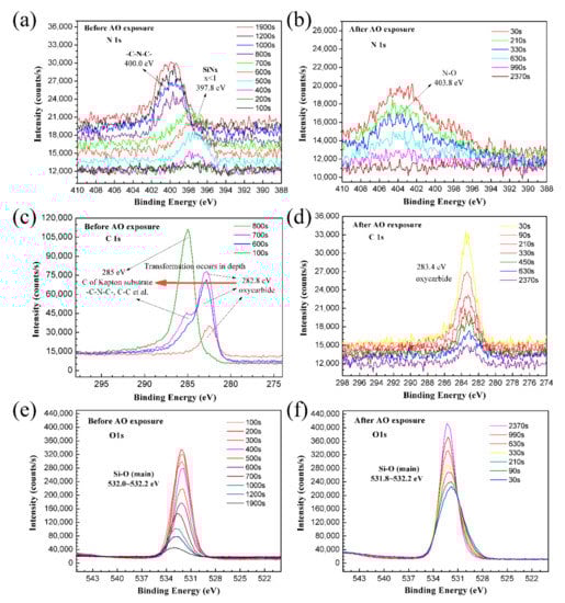 High-resolution narrow scans of the as-prepared and the AO-exposed PHPS coating were also detected, and the spectra are shown in Figure 8. For the as-prepared PHPS coating, the peak location of N 1s and C1s shifted during the etching. On the contrary, all peaks of the AO-exposed PHPS coating almost appeared at a fixed location during the etching and just their intensity changed. Figure 8a,b shows a set of N 1s spectra, which were composed of the N 1s spectrum obtained every 100 s from 30 s up to the end of the etching process. During the first 700 s of etching, only one peak located at ~397.8 eV was observed, corresponding to SiNx (x < 1) (Figure 8a). This peak might be caused by the incomplete hydrolysis of Si-N in PHPS. The intensities of this peak in inner layers were stronger than those in the outer layers. When the etching progresses to 800 s, the peak located at 397.8 eV disappeared. At the same time, another peak emerged at 400.0 eV whose peak area increased with the etching time. The peak corresponding to the C-N-C in imide [44] was attributed to the Kapton substrate, whose molecular structure is shown in Figure 7a. For the AO-exposed PHPS coating, all of the peaks appeared at 403.8 eV during the etching process, which was attributed to N-O. This peak mainly resulted from the oxidation of residual Si-N in the incompletely hydrolyzed PHPS coating. However, the signal was weak, indicating that the amount of NOx on the coating surface was little.