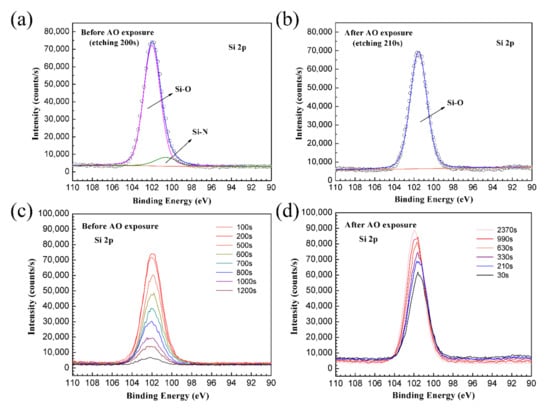 Si was another main element of the coating. Two peaks were observed in the Si 2p spectrum of the as-prepared coating as shown in Figure 9a. One peak at 102.0 eV and the other peak at 100.6 eV corresponded to SiOx and Si-N, respectively. These peaks originated from the incomplete hydrolysis of the PHPS coating. Only one peak appeared in the Si 2p spectrum of the AO-exposed PHPS coating (Figure 9b). The peak was situated at ~101.6 eV and corresponded to SiOx. The Si 2p peak intensity of the as-prepared PHPS coating dramatically decreased during etching progress (Figure 9c). On the contrary, that of the AO-exposed PHPS coating just slightly decreased after etching for 2370 s (Figure 9d). According to all of the XPS results, we concluded that AO exposure induced the increase of the O/Si atomic ratio of the SiOx layer on top surface of the PHPS coating, which strengthened the durability of the coating.