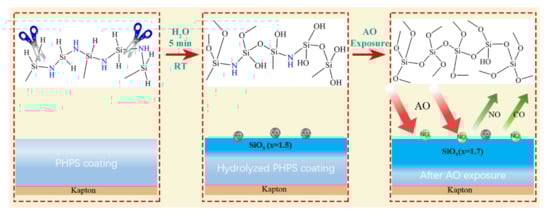 Schematic of the chemical reactions and the composition evolution of the PHPS coating during the hydrolysis and AO exposure.