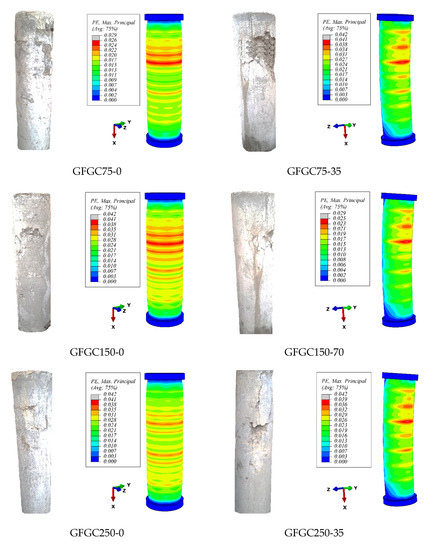 Due to reducing the time and costs of research, the most important methods for a technical aspect to characterize the interaction process, the diversity of the failure mechanism of FRPs, and the unique response between FRPs and concrete are finite element models (FEMs) [29]. Excessive deformations and local buckling regulate the structural integrity of glass-FRP-reinforced samples, according to tests and finite element simulations [30,31]. Numerical modelling can accurately describe the structural efficiency of glass-FRP columns under buckling load [32,33]. Finite element simulations were used to simulate the efficiency of glass-FRP reinforced short concrete columns with varied slenderness ratios [34,35]. Initial failure mode and post-buckling efficiency test results are very comparable to finite element analysis. The numerical models have a high accuracy in evaluating the load-deflection response and failure modes of glass-FRP-reinforced columns [4,36,37]. Even though some authors have attempted to compare the response of glass-FRP-reinforced hybrid fibre-reinforced geopolymer concrete (HFRGC) columns to plain concrete, none of them have looked at the efficiency of such elements integrating hybrid fibres. The primary goal of this study is to use investigations and nonlinear finite element simulations to investigate the structural response of GFGC columns under eccentric and concentric stresses.
