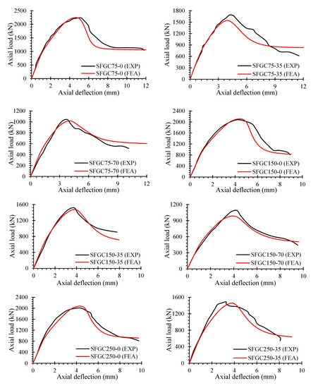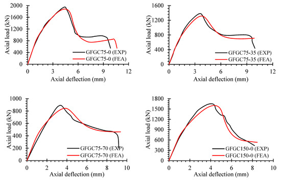 After confirmation for mesh size, element types, boundary conditions, and other HFRGC parameters, the reference FEM (GFGC75-0) showed variations of 2.6% and 6.8% for maximum AST and corresponding axial deflection from the tests. The elastic behavior, fracture patterns, and post-ultimate collapse efficiency of the reference sample were precisely described by the proposed FEM. Differences in the experimental and FEA testing environments, such as geometric imperfections, boundary conditions, material strength, sample manufacturing flaws, the differences in the features of glass-FRP rebars and steel rebars, as well as testing equipment accuracy, can be held responsible for minor discrepancies in the proposed FEM. The inconsistencies could potentially be attributed to FEA assumptions, such as assuming an ideal connection between HFRGC and rebars. The proposed FEM showed a strong connection with the tests and can be applied to analyse other SFGC and GFGC columns.