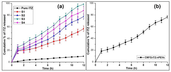 In vitro release of ITZ from (a) pure drug, S1-S4 ITZ-nPEVs, and (b) CMFG-ITZ-nPEVs (Mean ± SD).