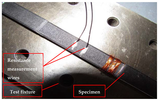 The multifunctional continuous carbon fiber solid laminate composites were designed by selecting the raw material manufactured by the Markforged Company (Watertown, MA, USA). Onyx with continuous carbon fiber supplied by Markforged was used [25]. The Onyx FR is a UL 94 V-0 Blue Card certified down to a thickness of 3 mm [26]. The carbon fiber was selected based on pre-defined criteria that required it to be longitudinally strong and commonly used in aerospace applications. A high strength-to-weight ratio was important in this design and selection. Markforged X7 AM machine (Markforged Company, Watertown, MA, USA) was used for the test coupons fabrication. The 3D-printed continuous carbon fiber solid laminate coupons were manufactured using the particular type of the FFF AM method called the continuous filament fabrication (CFF) for this work [27]. The use of the CFF [28] requires an additional nozzle to lay the additional material on the 3D-printed test coupons. Markforged X7 model’s Industrial Composite 3D Printers series was used at RE3DTECH company [29] located in Grayslake, IL, USA, with a raster angle of 0 degrees for the specimen fabrication. The fiber layout was in line with the longest dimension of the test coupons. The temperatures of the Onyx printing and fiber-laying nozzles were 275 °C and 250 °C, respectively. The diameters of the extruded Onyx and fiber materials were 0.40 mm and 0.9 mm wall thickness, respectively. The surface finish on the 3D-printed coupons was 0.125 mm layer height. The specimens were 3D-printed flatwise, and the continuous carbon fiber was laid zero degrees along the longitudinal axis of the specimens. The test specimens with instrumentation for measurement of the electrical property of the test specimens are shown in Figure 1.