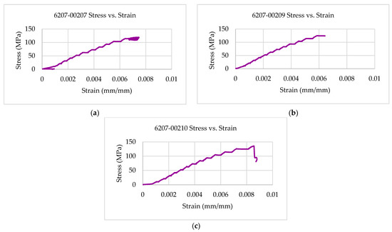 Strain–stress behavior of multifunctional test coupons at RTD: (a) 6207-00207; (b) 6207-00209; (c) 6207-00210.