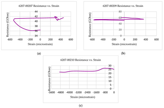 Figure 10 shows the quasi-static multifunctional Compressive-Electrical properties of the 3D-printed multifunctional continuous carbon fiber test specimens at RTD in the form of resistance versus strain behavior. Figure 10 shows the strain values corresponding to the maximum resistance values for each of the test coupons (6207-00303, 6207-00304, and 6207-00305) that were observed to be lower than the failure strain of those test coupons. The strain at peak resistance value, when compared with the respective failure strain, was found to be 96.69% lower than the associated failure strains for the specimen (6207-00209). The strain corresponding to the maximum resistance value for specimen 6207-00207 was observed to be 37.76% lower than the associated failure strain for that specimen (6207-00207). Similarly, the strain corresponding to the associated failure strains for the specimen 6207-00210 was found to be 87.45% lower than the associated failure strain for that specimen (6207-00210). The experimental results showed that the resistance values of the multifunctional specimens during the multifunctional tests were observed to be higher than the residual resistance values for the specimens—6207-00207, 6207-00209, and 6207-00210. The residual resistance value (50.5 G Ohms) for specimen 6207-00209 was observed to be lower than the resistance values recorded during the tests (61.2 G Ohms, 17.48% higher than 50.5 G Ohms). The residual resistance value (25.2 G Ohms) for the specimen 6207-00210 was found to be lower than the resistance values recorded during the tests (26.5 G Ohms, 4.91% higher than 21.7 G Ohms). Similarly, the residual resistance value (36.4 G Ohms) for the specimen 6207-00207 was found to be lower than the resistance values recorded during the tests (42.0 G Ohm, 13.33% higher than 36.4 G Ohms).