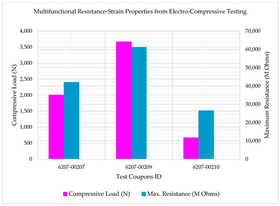 Figure 11 shows the multifunctional Compressive-Electrical behavior of the test coupons (6207-00207, 6207-00209, and 6207-00210) at RTD and shows coupling effects of compressive strength and electrical properties of the 3D-printed multifunctional carbon fiber composites. In Figure 11, the coupling effects of the compressive load corresponding to the maximum electrical resistance values of each test specimen are presented. As shown in Figure 11, the coupled Compressive-Electrical multifunctional properties of the test specimens—6207-00207 and 6207-00210 are found to be consistent with respect to the reported higher maximum resistance than their corresponding compressive loads, while for the test specimen 6207-00209, the coupled Compressive-Electrical multifunctional properties are found to be in a state that involved the reported maximum resistance to be lower than its corresponding compressive load. As shown in Figure 11, the compressive load corresponding to the maximum resistance value of 61.2 G Ohms for the specimen 6207-00209 was found to be lower than the failure compressive load recorded during the tests (4003.4 N, 8.33% higher than 3669.8 N). The compressive load corresponding to the maximum resistance value of 26.5 G Ohms for the specimen 6207-00210 was observed to be lower than the failure compressive load recorded during the tests (2668.9 N, 75% higher than 667.2 N). Similarly, the compressive load corresponding to the maximum resistance value of 42 G Ohms for the specimen 6207-00207 was observed to be lower than the failure compressive load recorded during the tests (3336.2 N, 40% higher than 2001.7 N). This may be attributed to material and manufacturing defects. The slight variation in values could be attributed to the lack of electrical shielding, as well as the difficulty of the MTS machine to add the electrical shielding system. Additional parameters contributing to the slight variation in the values are (1) compression testing fixture restricting enough access for the test personnel, (2) effects of special electrical wiring adhesion on the test specimens for this multifunctional properties’ evaluation, and (3) other manufacturing and processing defects, as well as environmental effects.