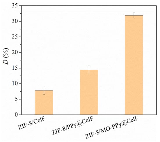 As shown in Figure 1, the ZIF-8 deposition ratio on CelF was effectively increased up to 31.8% when MO-PPy was used as the mediating layer. In contrast, without PPy, the deposition ratio of ZIF-8 on CelF was only 7.8%. When using PPy without MO doping, the deposition ratio of ZIF-8 was 14.4%, indicating that the MO-PPy in situ coated as a mediating layer can significantly promote the growth of ZIF-8 on CelF. The promoting effect of MO-PPy on the growth of ZIF-8 on CelF was mainly attributed to the adsorption of metal ions by NH groups of PPy [] and azo groups of MO molecules [].