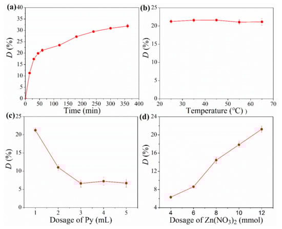 Effect of time (a), temperature (b), dosages of Py (c) and Zn(NO3)2 (d) on ZIF-8 deposition. Process conditions: (a) 25 °C, Py 1 mL, Zn(NO3)2 12 mmol; (b) Py 1 mL, Zn(NO3)2 12 mmol, 1 h; (c) 25 °C, Zn(NO3)2 12 mmol, 1 h; (d) 25 °C, Py 1 mL, 1 h.