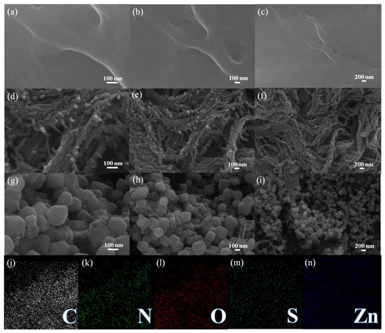 SEM images of CelF (a–c), MO-PPy@CelF (d–f), ZIF-8/MO-PPy@CelF (g–i); EDS images of ZIF-8/MO-PPy@CelF (j–n).