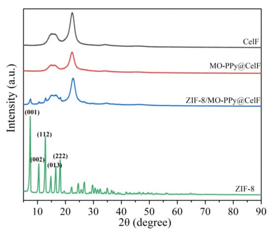 The XRD patterns of CelF, MO-PPy@CelF, ZIF-8 and ZIF-8/MO-PPy@CelF are shown in Figure 4. Both CelF and MO-PPy@CelF displayed the characteristic peaks of cellulose I with a sharp high-intensity peak (200) centered at 2θ = 22.5°; two peaks at 14.9° and 16.4° can be attributed to CelF []. The comparison of XRD patterns of CelF and MO-PPy@CelF shows that the coverage of amorphous MO-PPy on the surface of CelF does not change the crystal structure of CelF. Compared to CelF and MO-PPy@CelF, the peaks of ZIF-8/MO-PPy@CelF at 2θ = 7.3°, 10.4°, 12.7°, 14.7°, 16.4° and 18.0° associated to (011), (022), (112), (022), (013) and (222) of ZIF-8 crystal planes []. The above results confirmed that ZIF-8 nanocrystals were generated from 2-MI and Zn2+, resulting in the formation of ZIF-8/MO-PPy@CelF composite material.