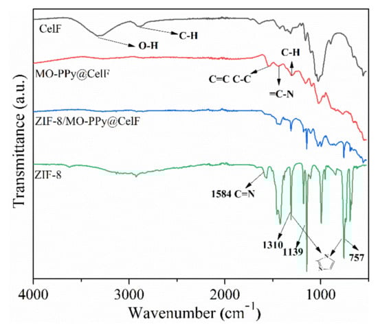 The FTIR spectra of CelF, MO-PPy@CelF, ZIF-8 and ZIF-8/MO-PPy@CelF were recorded; the results are displayed in Figure 5. The spectrum of CelF had obvious characteristic peaks of cellulose. The wide peak at about 3300 cm−1 was attributed to the O–H stretching vibration, and the peak at about 2990 cm−1 was ascribed to the C-H stretching vibration. After the deposition of MO-PPy, the O–H stretching vibration peak at 3300 cm−1 and the C–H stretching vibration at 2990 cm−1 were significantly weakened, which indicates that the cellulose was completely covered. The absorption peak at about 1630 cm−1 in the spectrum of MO-PPy@CelF was assigned to the N–H stretching vibration of PPy, demonstrating the successful decoration of PPy on pure CelF. For ZIF-8, the peak at 1584 cm−1 corresponded to the C=N stretching of the imidazole ring [,]; the convoluted peaks at 1500–600 cm−1 were attributed to the entire imidazole ring stretching or bending effects []. It can be found that the FTIR spectrum of ZIF-8/MO-PPy@CelF contained the characteristic peaks of CelF and ZIF-8. The characteristic peaks at 1139, 1310 and 757 cm−1 in the ZIF-8 appeared in ZIF-8/MO-PPy@CelF, indicating the successful growth of ZIF-8 nanoparticles on MO-PPy@CelF.