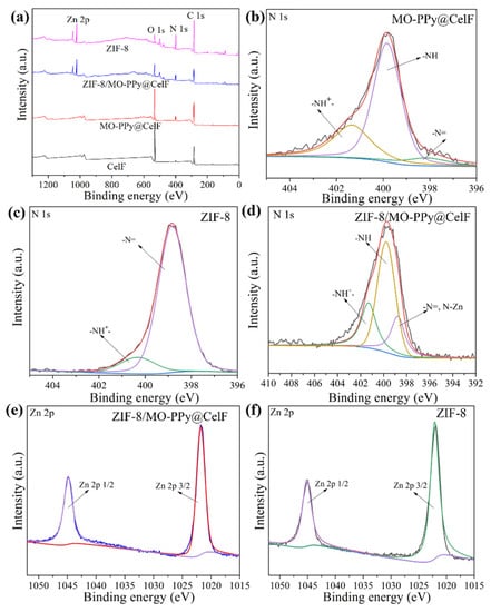 (a) XPS wide scan spectra of CelF, MO-PPy@CelF, ZIF-8 and ZIF-8/MO-PPy@CelF; (b–d) N 1s XPS spectra of MO-PPy@CelF, ZIF-8 and ZIF-8/MO-PPy@CelF; (e,f) Zn 2p spectra of ZIF-8/MO-PPy@CelF and ZIF-8.