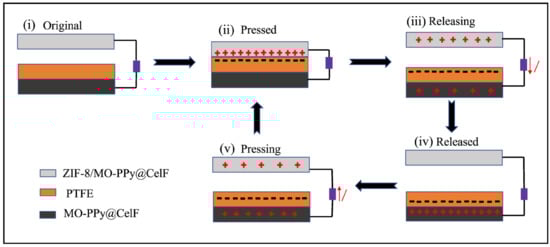 In a contact-separation operating mode, the working principle of the C-TENG is based on the coupling effect of contact electrification and electrostatic induction [], as shown in Figure 7. In this work, ZIF-8/MO-PPy@CelF was used as a positive friction layer and electrode material, mainly based on the fact that ZIF-8/MO-PPy@CelF exhibits electrical conductivity (Figure 8). Meanwhile, MO-PPy@CelF with a conductivity of 9.8 S·m−1 was used as a bottom electrode, attached on the bottom of the PTFE film. In the initial state, no charges generate on the surface of ZIF-8/MO-PPy@CelF composite or PTFE (Figure 7i). Nevertheless, when the two friction layers are in full contact, static electrostatic charges are generated on the two friction materials driven by external forces (Figure 7ii). Owing to the high triboelectric positivity of the ZIF-8/MO-PPy@CelF and the strong triboelectric negativity of the PTFE, these two triboelectric materials tend to lose and gain electrons during contact, respectively. Consequently, the negative charges are generated on the PTFE and the positive charges are inducted on the top ZIF-8/MO-PPy@CelF due to the contact electrification effect. In this state, no electrons flow through the external circuit, because the induced charges of opposite polarity are in equilibrium. Whereas after releasing the external force, the top ZIF-8/MO-PPy@CelF starts to separate from the PTFE, thus resulting to an electrostatic field between the top ZIF-8/MO-PPy@CelF and bottom MO-PPy@CelF (Figure 7iii). The electrostatic field drives the flow of electrons from the bottom MO-PPy@CelF to the top ZIF-8/MO-PPy@CelF, thereby generating a current with an opposite direction. When the triboelectric layer is completely released, the electric signal disappears due to the equilibrium state of the triboelectric charges (Figure 7iv). When the TENG is pressed again, the reduction in the distance between the friction layers leads to an opposite electric potential, thus generating a current flowing from the bottom of the MO-PPy@CelF to the top of the ZIF-8/MO-PPy@CelF (Figure 7v). Modification of CelF surface with ZIF-8 facilitates the accumulation of positive charges, thus increasing charge transfer and improving the output performance of TENG [].