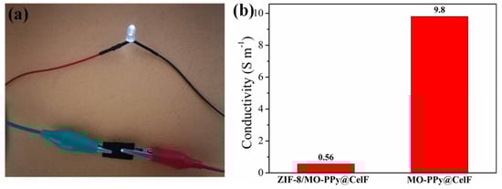 (a) Lighting of an LED using the ZIF-8/MO-PPy@CelF with 31.8% ZIF-8 deposition ratio (0.85 mm thick); (b) Conductivity values of ZIF-8/MO-PPy@CelF and MO-PPy@CelF.