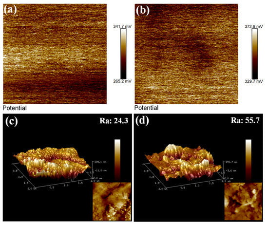 Surface potentials of ZIF-8/MO-PPy@CelF with 17.4% (a) and 31.8% (b) ZIF-8 deposition ratios; Surface roughness values of ZIF-8/MO-PPy@CelF with 17.4% (c) and 31.8% (d) ZIF-8 deposition ratios.