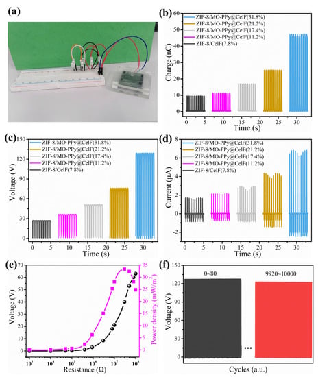 In this work, both the surface potential and roughness of CelF surface can be improved by increasing the deposition ratio of ZIF-8 on CelF surface. Whereas the limited ability of pure CelF to adsorb and chelate metal ions leads to less deposition of ZIF-8 on CelF surface. The MO-PPy generated in situ was used as a mediating layer to increase the deposition ratio of ZIF-8 on CelF surface, thereby improving the performance of C-TENG. Therefore, we focused on the effect of ZIF-8 deposition on the output performance of TENG such as transfer charge, short-circuit current and open-circuit voltage. Figure 10a show an image of the C-TENG. As shown in Figure 10b–d, the transfer charge, open-circuit voltage and short-circuit current of the modified C-TENG increased with an increasing deposition ratio of ZIF-8. When the deposition ratio of ZIF-8 was 31.8%, the transfer charge was the highest (47.4 nC) (Figure 10b). Charge transfer of the triboelectric materials played an important role in the output performance of TENG []. The open-circuit voltage increased from 27 V to 129 V (Figure 10c) and the short-circuit current increased from 1.7 μA to 6.8 μA (Figure 10d), approximately four times higher than those of the unmodified C-TENG, as the deposition ratio of ZIF-8 increased from 7.8% to 31.8%. Meanwhile, we calculated the current densities as shown in Figure S2. The good output performance of TENG is mainly attributed to more ZIF-8 deposition on the CelF surface. The more ZIF-8 deposited on the CelF surface, the positive polarity was stronger, and the more surface charge was generated on surface of materials.