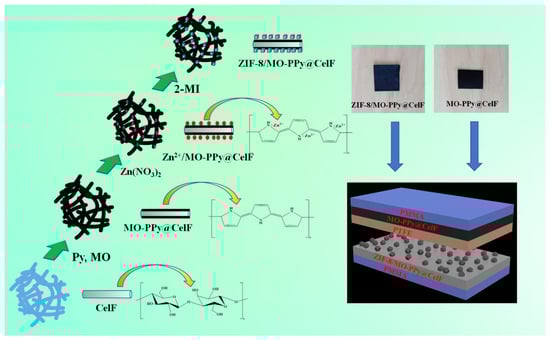 2.2.3. Preparation of ZIF-8/MO-PPy@CelF Composite