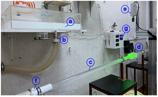 Photo of the test bench. (a) tank with polymer solution in distilled water; (b) valve; (c) Plexiglass pipe; (d) rectangular duct; (e) laser; (f) resistance thermocouple; (g) temperature monitor.