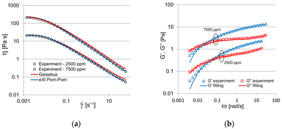 Viscosity curve (a) and dynamic moduli (b); experiment and fitting with four-mode Giesekus and eXt. Pom-Pom models (2500 ppm at T = 22.8 °C and 7500 ppm at T = 20.0 °C).
