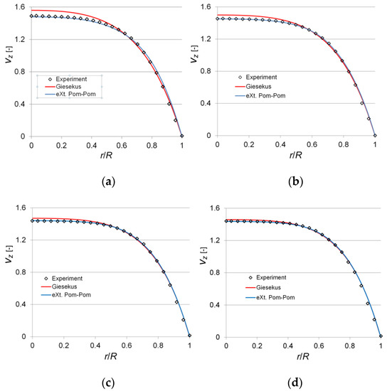 Dimensionless axial velocity profiles in the pipe for various Wi ( ): (a) Wi = 4.80; (b) Wi = 11.76; (c) Wi = 19.29; (d) Wi = 24.63.
