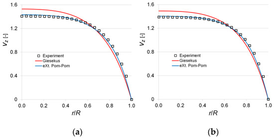 Dimensionless axial velocity profiles in the pipe for various Wi (): (a) Wi = 4.29; (b) Wi = 6.74.