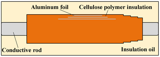 The composite insulation structure in the bushing is composed of aluminum foil and oil immersed cellulose polymer wrapped closely, as shown in Figure 5. The electrical conductivity of the cellulose polymer insulation can be obtained by using simplified X-Y model when the electrical conductivity of the whole insulating material is known [20].
