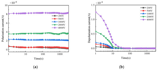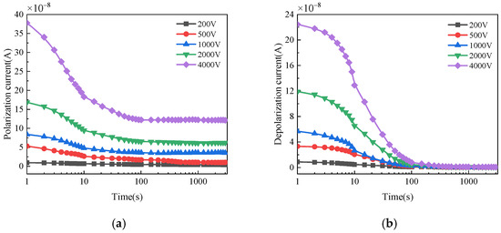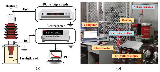 PDC tests in different DC voltages are carried out; the schematic diagram and physical diagram of PDC test is shown in Figure 3. In this paper, the DC high voltage power supply(AU-20*60, Matsusada, Osaka, Japan) is used to excite the bushing, and the high-precision electrometer(6517 B, Keithley, OH, USA) is used to collect the current signal at the end screen of the bushing. The polarization/depolarization process of the bushing cellulose polymer can be further explained by analyzing the changes in the excitation voltage and response current. The charge and discharge process for bushing lasts for 3000 s, and the applied voltages are 200 V, 500 V, 1000 V, 2000 V and 4000 V, respectively, and the environmental temperature and relative humidity are 20 °C and 62%, respectively.