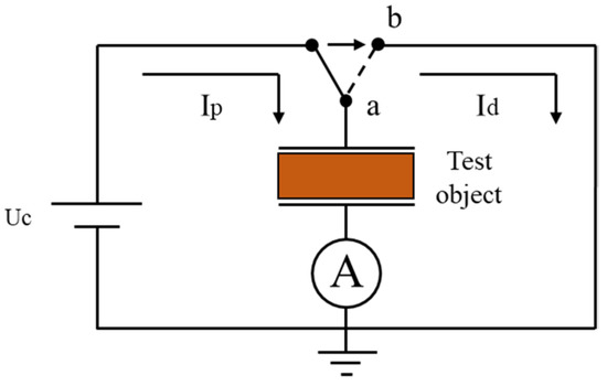 By applying and removing DC voltages to the insulating medium, the dielectric response characteristics in time domain from the polarization and depolarization current can be extracted based on a PDC test. The schematic diagram is shown as Figure 4. By connecting the switch to point a and then point b, the insulating medium is charged and then discharged, these two processes are polarization and depolarization processes of the insulating medium, respectively, and the current generated in these two processes are called polarization current and depolarization current , correspondingly.