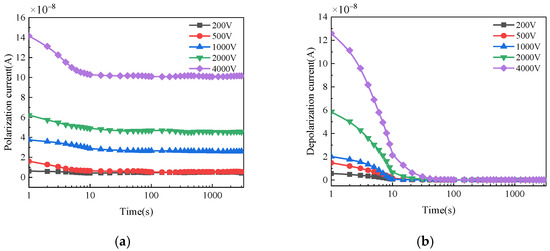 When the time of polarization and depolarization process is equal and long enough, the current difference at the final moment is equal to the conductance current, as shown in Equation (9). The electrical conductivity σr of the composite insulating medium can be obtained from the conductance current, as shown in Equation (10).