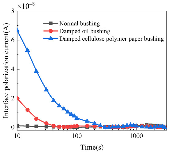 The interface polarization current of the three bushings can be calculated by Equations (1)–(3), as shown in Figure 10 and Figure 11. Figure 10 shows that the interface polarization current of the bushing with different moisture condition decreases to zero with time. While for normal bushing, the interface polarization current does not change significantly and always tends to be zero. Compared with dampened oil bushing, the initial interface polarization current of the bushing with dampened cellulose polymer insulation is larger and takes longer time to decay to zero. Figure 11 reflects that with the increase in applied DC voltage, the interface polarization current increases, and the current decreases slowly with the time.