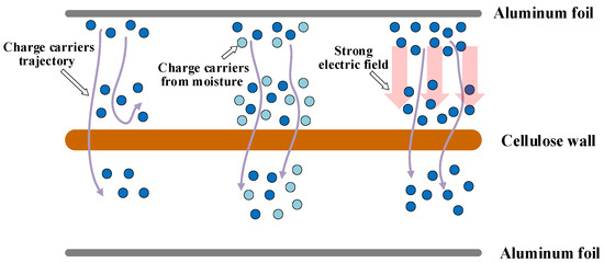 The insulation system of the bushing is composed of aluminum foil and cellulose polymer, and the dielectric constants of both are different. When applying DC voltage in the insulation system, the interface polarization process occurs, and an interface polarization current is generated. When the voltage increases, the electric field becomes larger, accelerating the motion of the charge carriers. When the moisture infiltrates into the insulation medium, the water molecules are ionized to produce more charge carriers under the effect of electric field. This explains the characteristic of interface polarization current under the influence of moisture content and applied DC voltage. The migration process of charge carriers at the cellulose polymer interface is shown in in Figure 12.