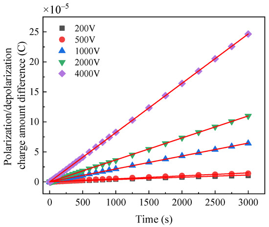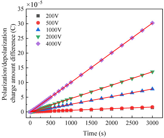 - The charge amount difference of polarization and depolarization current is linearly aligned with the time, and the slope becomes larger with the increase in moisture, which is more obvious under high applied voltage. Water molecules produce more charge carriers after being ionized and provide more paths for charge movement.