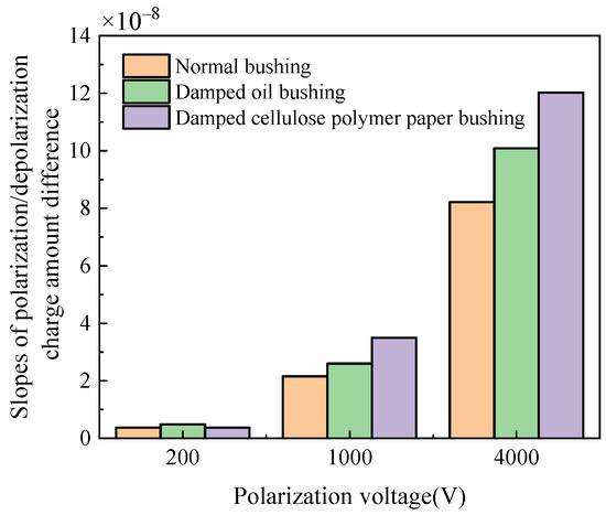 The slopes of the polarization/depolarization charge amount difference at 200 V, 1000 V and 4000 V are shown in Figure 16. It is indicated that the slopes at larger applied DC voltage are much higher and more distinguished than those at lower applied DC voltages, which indicates that the moisture condition can be confirmed by the slope of charge amount difference curve at high applied DC voltage in PDC test.