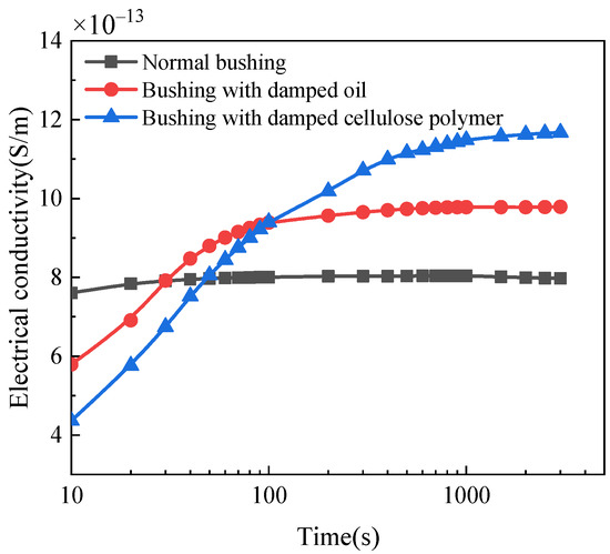 The electrical conductivity change behavior of cellulose polymer insulation with different moisture conditions is shown in Figure 17. It is shown that the electrical conductivity increases with time and tends to be stable after 1000 s. The stable value of electrical conductivity is the real electrical conductivity σ. The geometric capacitance of the insulation in the bushing is 228 pF, thus the real electrical conductivity of normal, bushings with dampened oil and dampened cellulose polymer insulation are 7.9748 × 10−13 S/m, 9.7884 × 10−13 S/m and 1.1672 × 10−12 S/m, respectively. The results indicate that electrical conductivity increases when the moisture content in the insulation material is higher, leading to the deterioration of the insulation performance.