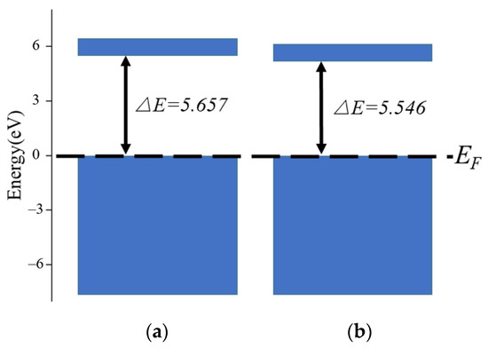 The band structure of unmoistened cellulose and moistened cellulose is shown in Figure 18. It can be seen that the band width (ΔE) of unmoistened cellulose is 5.657 eV, while the band gap width of moistened cellulose is 5.546 eV. The wider the band width, the weaker the electrical conductivity. The energy band width of cellulose is narrowed after the water content of cellulose is increased, so the moistened cellulose polymer insulation electrical conductivity is stronger.