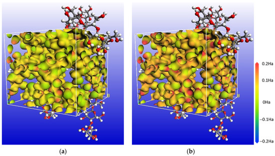 Electrostatic potential of two cellulose models: (a) Cellulose model; (b) Cellulose model with 3.5% water.