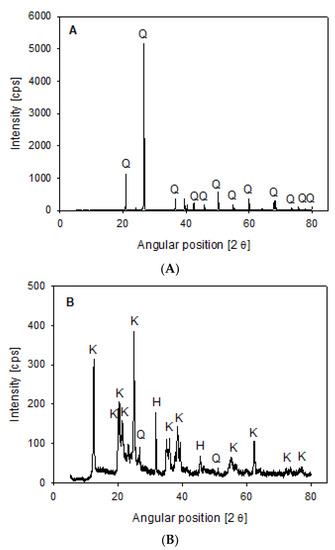 The synthetic tailings were composed of quartz and kaolin purchased from Donde Capo (Santiago, Chile) and Ward’s Science (Rochester, NY, USA). XRD analysis was performed on a Bruker D8 ADVANCE X-ray diffractometer (Bruker, Karlsruhe, Germany) using the Powder Diffraction File of 2020 ICDD (International Center for Diffraction Data) software TOPAS (version 5, Bruker, Billerica, MA, USA). Quartz presented 99% SiO2 (Figure 1A), while kaolin was mainly made up of kaolinite (<80%) and halite (>10%), with SiO2 (1–10%) as a minor phase (Figure 1B).