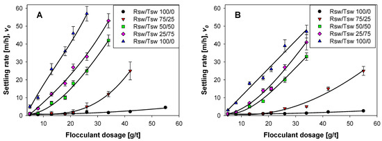 Effect of flocculant dosage on the settling rate of synthetic tailings, using raw seawater (Rsw) and treated seawater (Tsw) at different proportions. (A): Tailings 1 with quartz/kaolin at 90/10 ratio; (B): Tailings 2 with quartz/kaolin at a 75/25 ratio. Solid concentration: 10 wt%, pH 11.