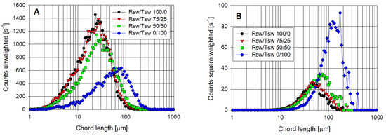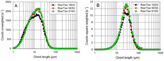 (A) unweighted and (B) square-weighted chord length distributions from the flocculation of synthetic tailings in raw seawater (Rsw) and treated seawater (Tsw). Tailings 2 (Qz/Kao 75/25), solid concentration 10 wt%, flocculant dosage 20 g/t, flocculation time 90 s (after dosing).