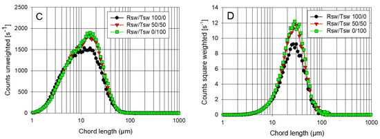 Focusing on the synthetic tailings with the highest clay content (Tailings 2, Qz/Kao 75/25), Figure 8 contrasts the unweighted and square-weighted CLDs at 90 s after the flocculant is dosed in water with different ratios of Rsw and Tsw. While the unweighted CLD in 100% Rsw shows a peak intensity only slightly lower than that prior to flocculation (Figure 6C), there was a substantial reduction in the counts <10 µm, indicative of the solids within this finer region of the CLD (almost certainly small, coagulated aggregates themselves) being captured into larger but still only moderately sized aggregates. The corresponding volume-weighted distribution (Figure 8B) shows a peak between 40 and 50 µm, representing a small shift from the unflocculated peak near 30 µm (Figure 6D).