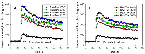 Flocculation kinetics (dosage 20 g/t) as monitored by FBRM for synthetic tailings made up of different ratios of raw seawater (Rsw) and treated seawater (Tsw). (A): Qz/Kao 90/10; (B): Qz/Kao 75/25.