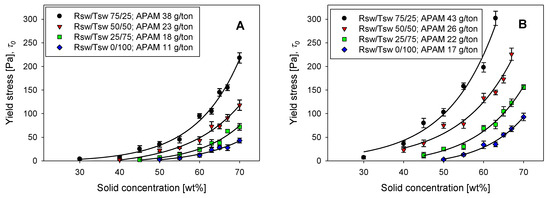 Yield stress of clay-based synthetic tailings flocculated in a range of solid concentrations, using raw seawater (Rsw) and treated seawater (Tsw) at different proportions. (A): Tailings 1 with quartz/kaolin at 90/10 ratio; (B): Tailings 2 with quartz/kaolin at a 75/25 ratio.
