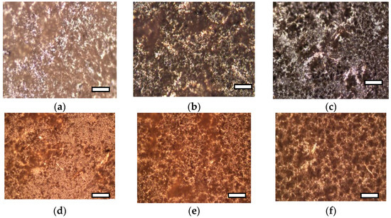 POM images of the surface of the PHBV/PCL/CNC composite films: PHBV/PCL(1:1)/CNC(PVP)–5 (a); PHBV/PCL(1:1)/CNC(PVP)–10 (b); PHBV/PCL(1:1)/CNC(PVP)–15 (c); PHBV/PCL(1:1)/CNC(PAM)–5 (d); PHBV/PCL(1:1)/CNC(PAM)–10 (e); PHBV/PCL(1:1)/CNC(PAM)–15 (f). The scale is 100 μm.