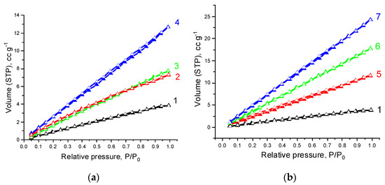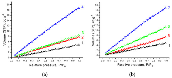 Low-temperature nitrogen adsorption (filled symbols) and desorption (open symbols) isotherms on the samples: 1—PHBV/PCL(1:1), 2—PHBV/PCL(1:1)/CNC(PVP)–5, 3—PHBV/PCL(1:1)/CNC(PVP)–10, 4—PHBV/PCL(1:1)/CNC(PVP)–15 (a); 5—PHBV/PCL(1:1)/CNC(PAM)–5, 6—PHBV/PCL(1:1)/CNC(PAM)–10, 7—PHBV/PCL(1:1)/CNC(PAM)–15 (b).