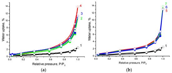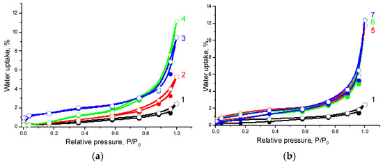 Water vapor adsorption (filled symbols) and desorption (open symbols) isotherms at 25 °C on the samples: 1—PHBV/PCL(1:1), 2—PHBV/PCL(1:1)/CNC(PVP)–5, 3—PHBV/PCL(1:1)/CNC(PVP)–10, 4—PHBV/PCL(1:1)/CNC(PVP)–15 (a); 5—PHBV/PCL(1:1)/CNC(PAM)–5, 6—PHBV/PCL(1:1)/CNC(PAM)–10, 7—PHBV/PCL(1:1)/CNC(PAM)–15 (b).