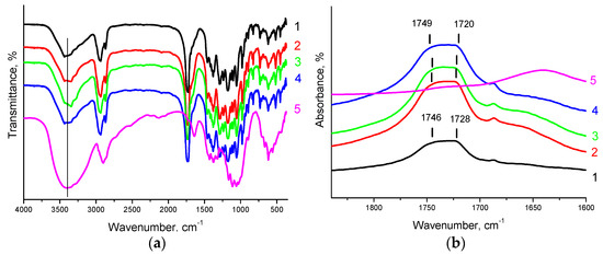 FTIR spectra of the PHBV/PLC(1:1) mixture (1); PHBV/PCL(1:1)/CNC(PVP)–5 (2), PHBV/PCL(1:1)/CNC(PVP)–10 (3), PHBV/PCL(1:1)/CNC(PVP)–15 (4) composites; the neat CNC (5): (a) in the 4000–400 cm−1 range; (b) in the 1850–1600 cm−1 range.