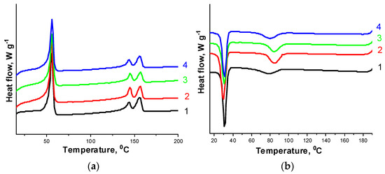 DSC curves for the PHBV/PCL(1:1) mixture (1); PHBV/PCL(1:1)/CNC(PVP)–5 (2), PHBV/PCL(1:1)/CNC(PVP)–10 (3), and PHBV/PCL(1:1)/CNC(PVP)–15 (4) composites: at heating (a); at cooling (b).